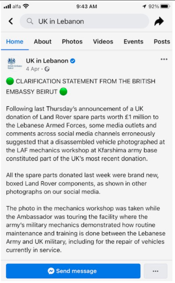 The Embassy’s explanations coupled with the additional photos asserted that Al-Manar’s claim about “junk” aid was false and that “all the Land Rover spare parts donated last week were new as seen in the photos.” The statement added: "A photo of a mechanical workshop was taken during the ambassador's tour in the facility where the army's military mechanics explained how routine maintenance and training are performed between the Lebanese and the British armies with used spare parts.”