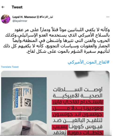 As one example, @layalmnsr, who has more than 4,400 Twitter followers, wrote: “As if the death and destruction of the Lebanese over the decades by the American weapon used by the Israeli enemy, as well as the wars and strife raised by Washington in the region, as well as the siege, sanctions and starvation policies are not enough for them, as if all of that is not enough, for them to bring them the ominous ambassador of death in the form of a vaccine.” She ended with the hashtag - #لقاح_الموت_الأميركي - #AmericanDeathVaccine.”
