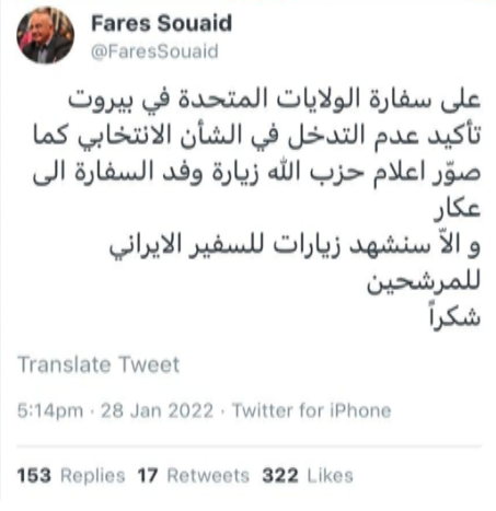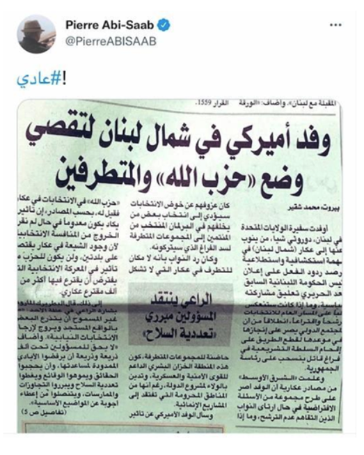 Abi-Saad commented on Asharq al-Awsat’s report about the delegation’s exploratory visit by saying it was “ordinary,” while Fares Souaid asked the US embassy to issue a clarification confirming its non-interference in electoral affairs, lest similar visits be undertaken with Lebanese candidates by Iran’s ambassador, as per Souaid.