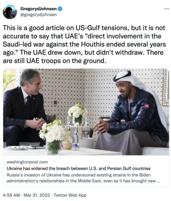 But as Gregory Johnsen, a non-resident fellow for the Sanaa Center for Strategic Studies, quickly noted, “it is not accurate to say that UAE's ‘direct involvement in the Saudi-led war against the Houthis ended several years ago.’ The UAE drew down but didn't withdraw. There are still UAE troops on the ground.”