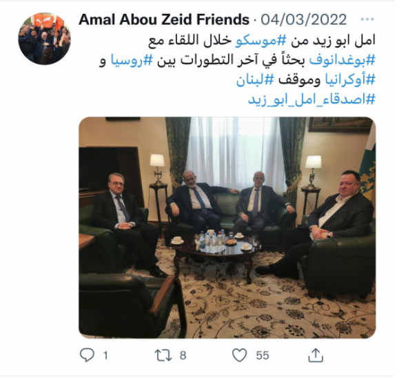 As for the concerned official, the advisor of the president of the republic, former Deputy Amal Abou Zeid, he chose to categorically deny the report regarding his non-reception by Bogdanov with a tweet accompanied by a picture of him with Bogdanov on the “Friends of Amal Abou Zeid” Twitter account on March 4, 2022, i.e. just one day after the fake report was published. And the account captioned the picture as follows: