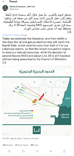 This wiggle room has come in for a torrent of criticism from anti-establishment parties and “civil society MPs” lately as news broke about the imminent arrival of an Israeli-commissioned drilling rig to the disputed area between Line 23 and 29. One such voice, newly elected MP Halimé El Kaakour, took to Twitter on May 25 declaring, “Today we celebrate Liberation Day, and then within a few days the oil and gas production ship will reach the Karish field, which extends more than halfway into our Lebanese waters, so that the Israeli occupation begins to steal our natural resources, while the decision to amend Decree 6433 and adopt Line 29 is still hijacked without being presented to the Council of Ministers. Line 29 is our maritime border, according to all scientific and legal studies. Adoption of the decree is a duty to prevent its violation, to preserve Lebanon's rights in the Karish field, and to immediately disrupt the theft of gas from under our waters. This confrontation is ours.”