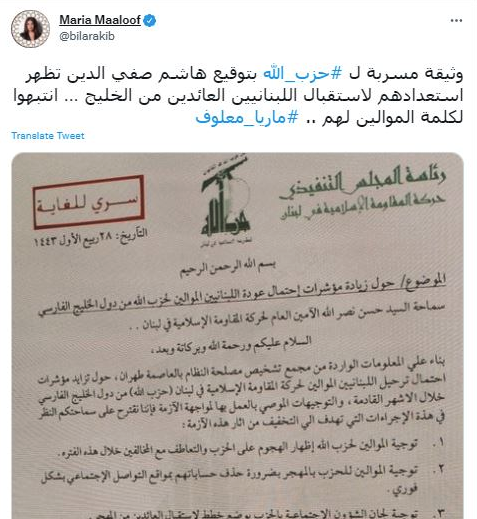It should also be noted that the November 4, 2021 “leaked document” was not the first document leaked by Maaloof which was debunked. Indeed, two days later, on November 6, 2021, she also posted a document about “Increasing signs pointing to return of pro-Hezbollah Lebanese from Persian Gulf States,” which was also denied by Hezbollah’s media office according to Annahar’s own fact-checking article linked above.